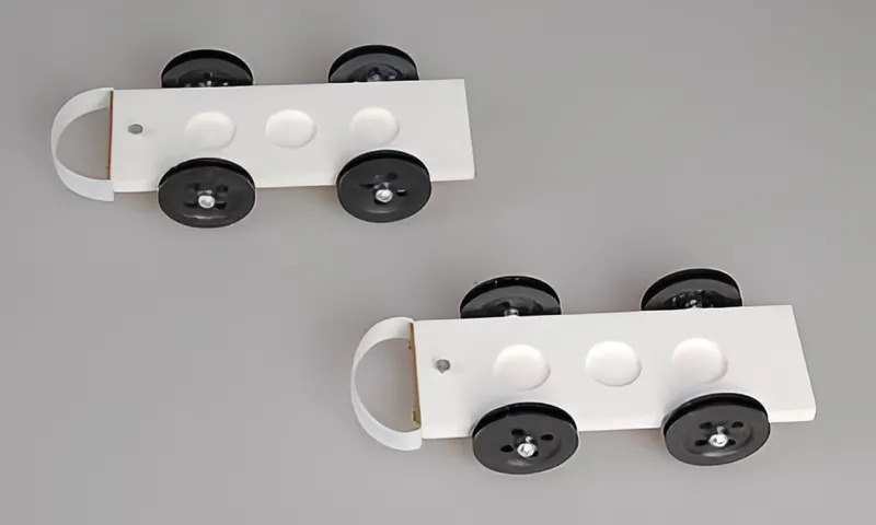 Тележки представляют собой платформы на четырех колесах. Торцевые кромки платформ оснащены с одной стороны пластиковой пружиной и шурупом для связывания тележек нитью. На платформах имеются три гнезда для установки грузов.