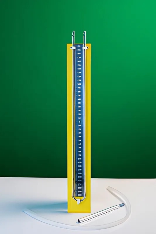 Прибор представляет собой U-образную стеклянную трубку, укрепленную на пластине со шкалой с делениями через 5 мм и нулем посередине. Для закрепления прибора в лапке штатива в скобу на обратной стороне вкручивается винт.