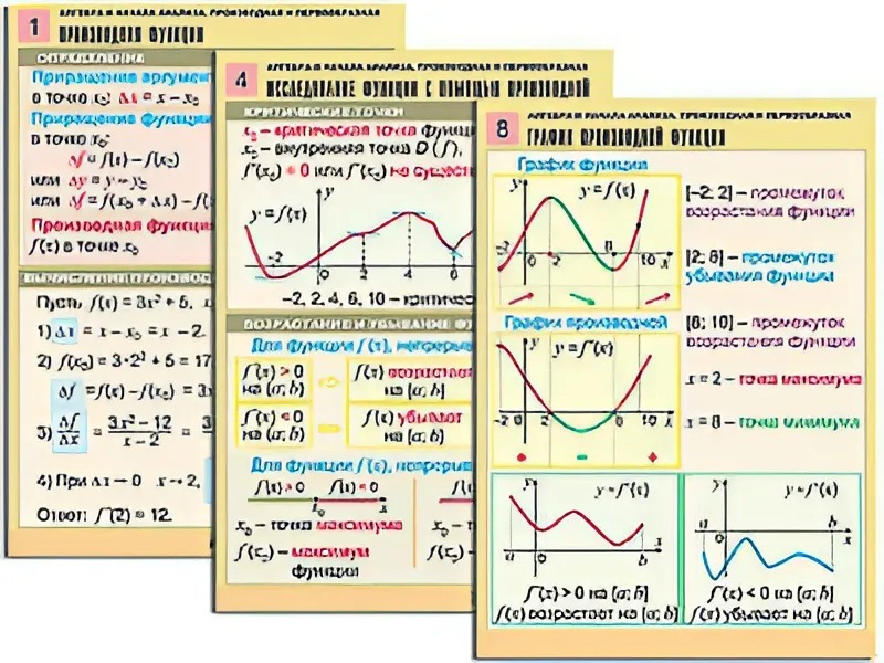 Комплект учебно-наглядных пособий "Алгебра и начала анализа. Производная и первообразная" формата А1 с полноцветной двухсторонней печатью и матовой двухсторонней ламинацией в количестве 12 таблиц