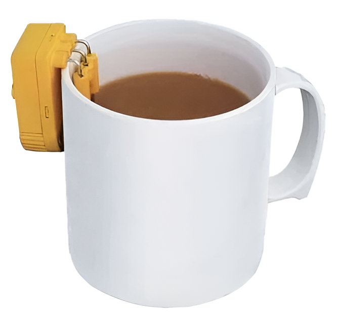 Повесьте прибор на любой край чашки, и он оповестит Вас серией звуковых сигналов или вибрацией когда чашка наполнится жидкостью до безопасного предела.