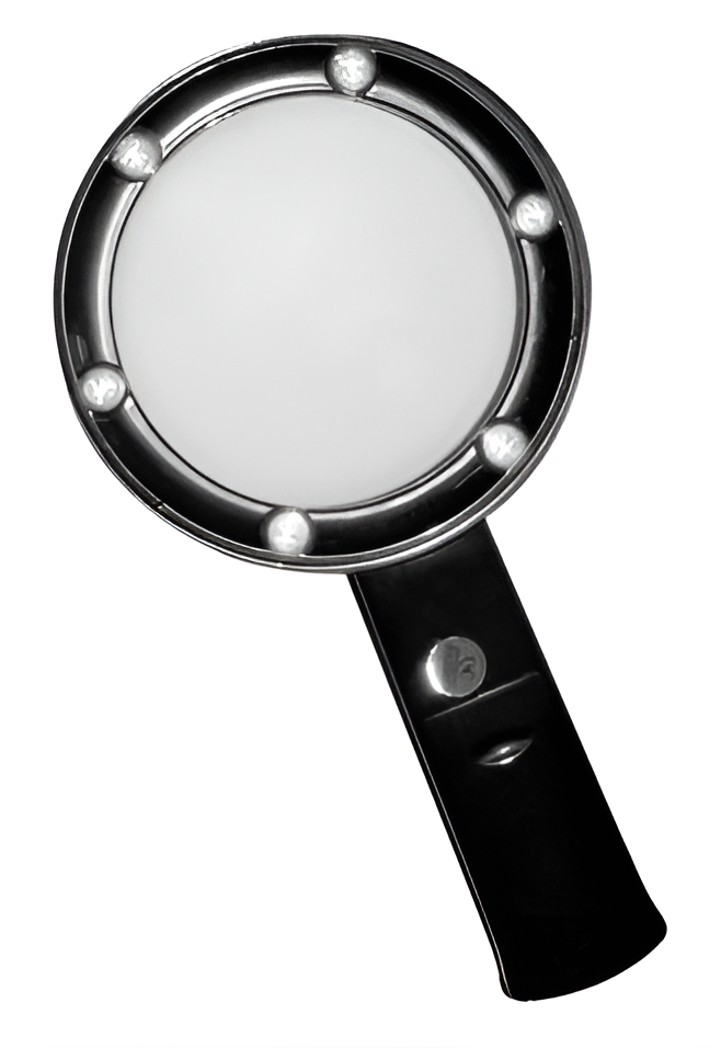 Лупа ручная круглая 5-кратная, диаметр 75 мм, со светодиодной подсветкой. Шесть ярких светодиодов, расположенных вокруг линзы, освещают объекты или читаемый текст. Незаменима для тех, кому нужно разглядеть мелкие детали изображения или текста.
