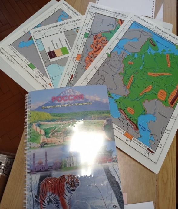 Пособие представляет собой набор из четырех физических рельефно-графических карт и одной контурной карты России, а также альбома с их описанием. Информация в картах и альбоме представлена плоскопечатным шрифтом и шрифтом брайля.