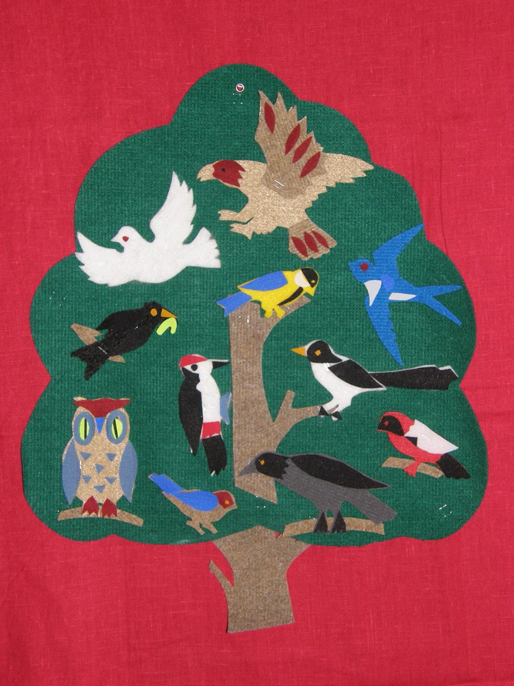 На основание на липучках прикрепляются фигурки птиц — сокол, голубь, ласточка, скворец, дятел, сорока, ворона, сова и снегирь.
