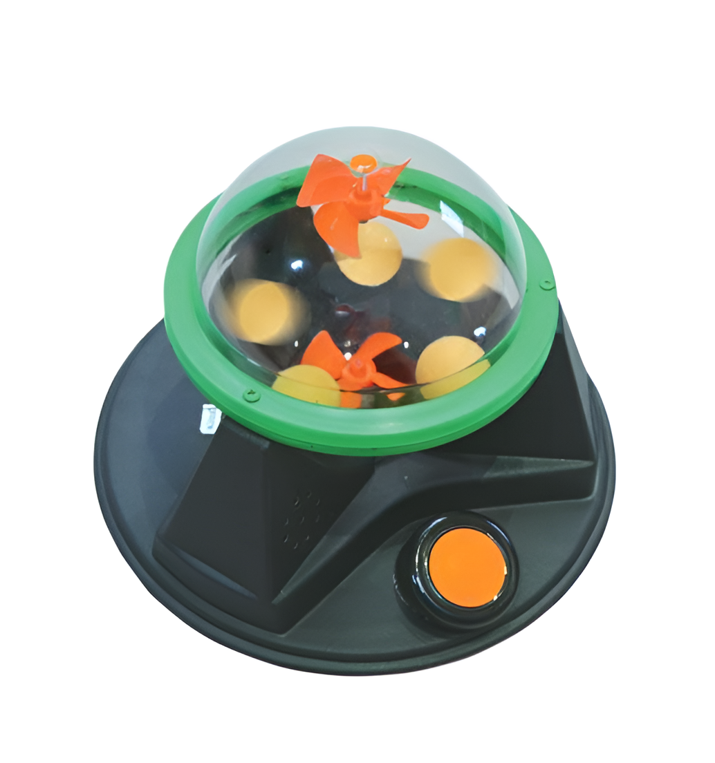 Чтобы три шарика для пинг-понга начали вращаться под пластиковым колпаком, нажмите на черно-оранжевую кнопку-переключатель или воспользуйтесь адаптированным внешним переключателем (не входит в комплект).