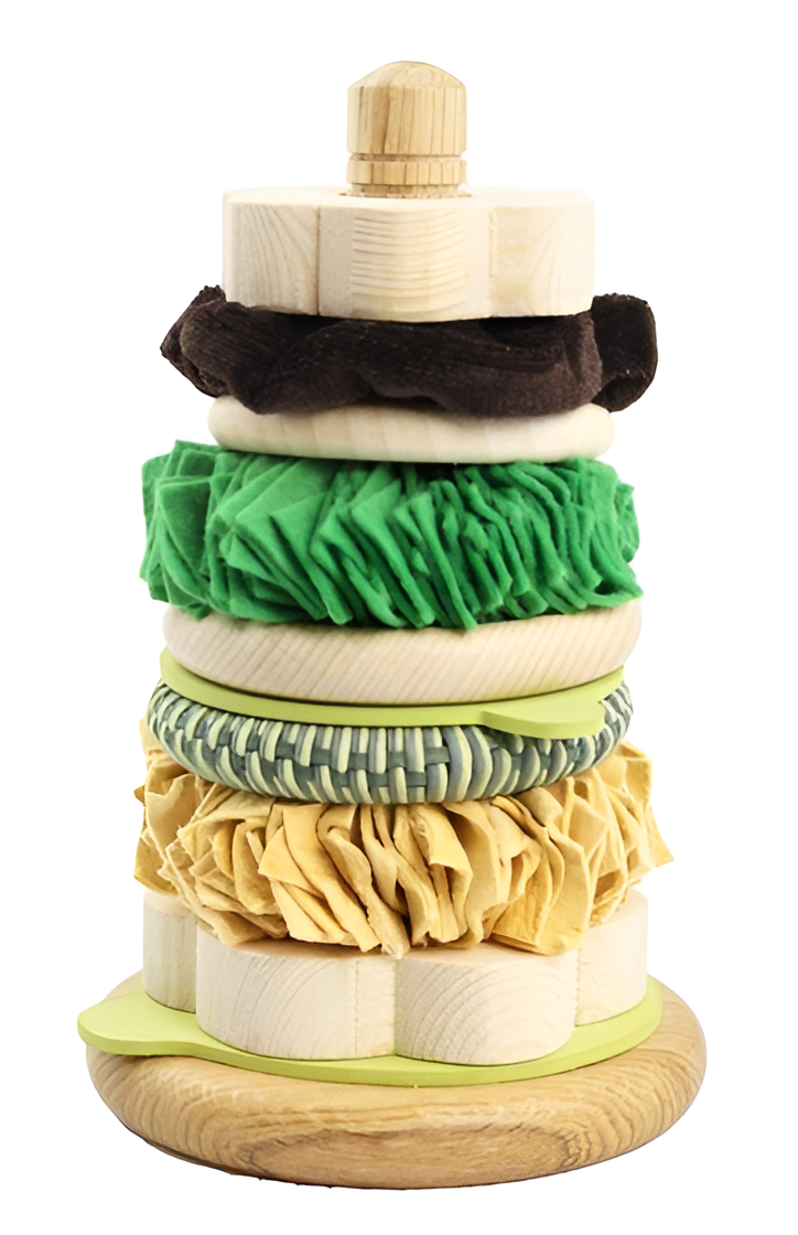 Кольца пирамидки выполнены из разных материалов и имеют разную на ощупь текстуру, что способствует развитию мелкой моторики.