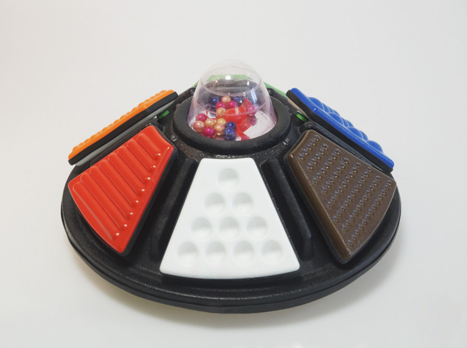 Текстурированная карусель – это игровой модуль, который представляет из себя аудио-визуальное устройство, с 6 съемными клавишами, разных цветов, разного рельефного рисунка на поверхности. Клавиши на устройстве можно нажимать, при активации какой-либо клавиши, будет воспроизводиться мелодичный, звуковой сигнал, который в свою очередь сопровождается визуальным эффектом (мерцанием огоньков на корпусе устройства). Питание устройства осуществляется от батареек типа АА.