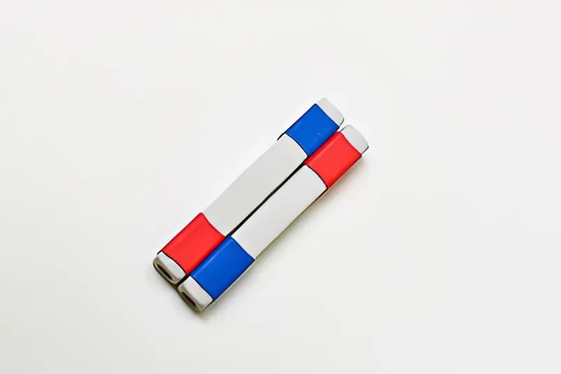 Магниты изготовлены из ферромагнитного вещества. Диаметр магнита 12 мм, длина 50 мм. Половины магнита обозначены красной и синей термоусадочной пленкой.