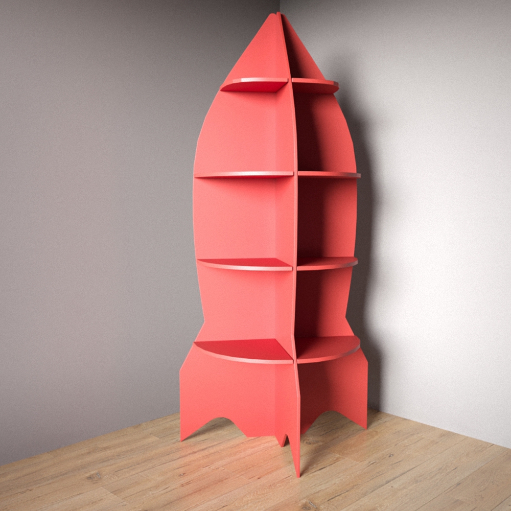 Стеллаж выполнен в форме ракеты, что привлекает внимание детей.