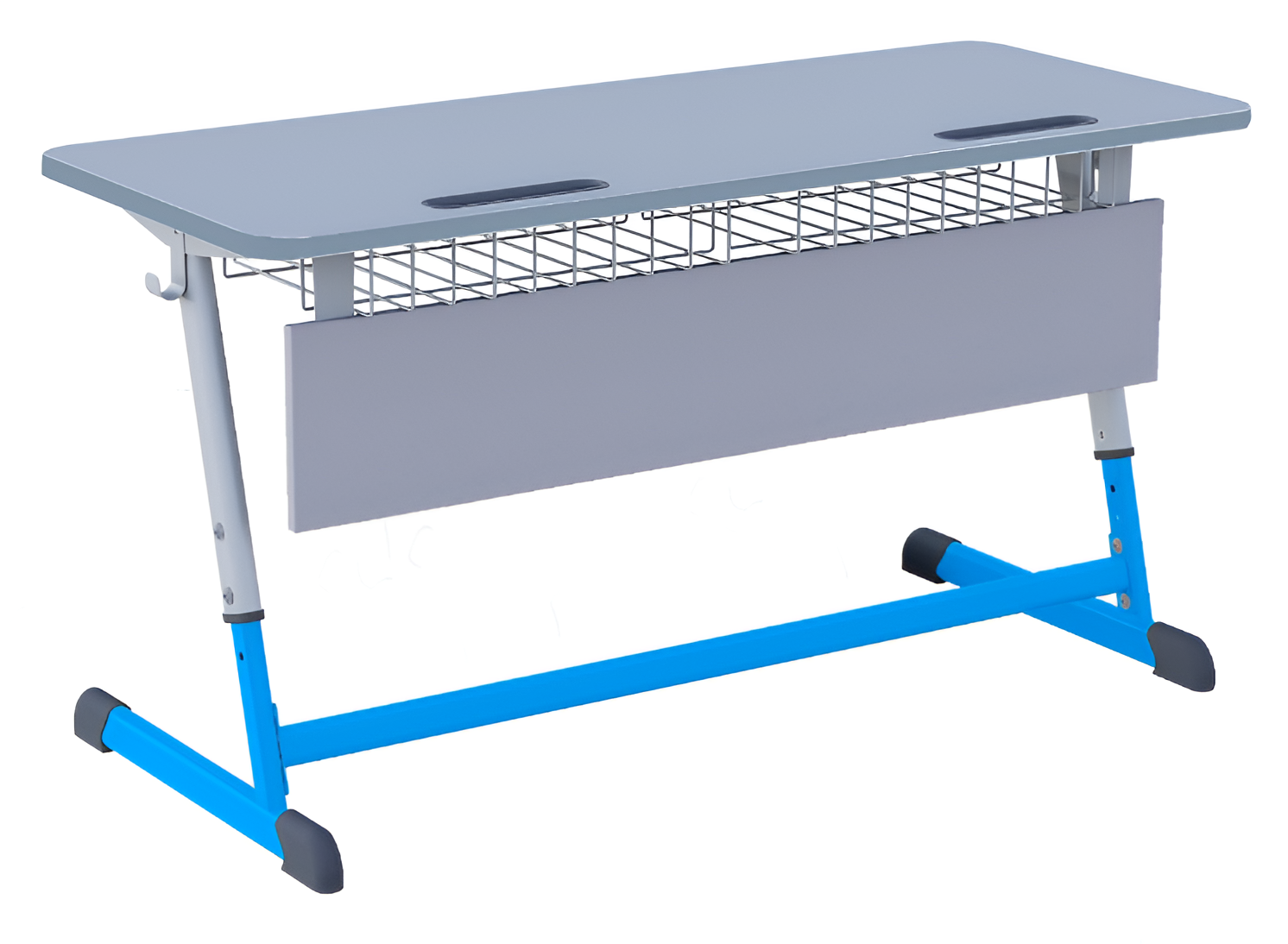 Парта NOMAD двухместная регулируемая по высоте имеет металлическое основание, столешницу ЛДСП с кромкой ПВХ, встроенные пластиковые пеналы, сетку для принадлежностей, крючки для рюкзаков, царгу из ЛДСП.