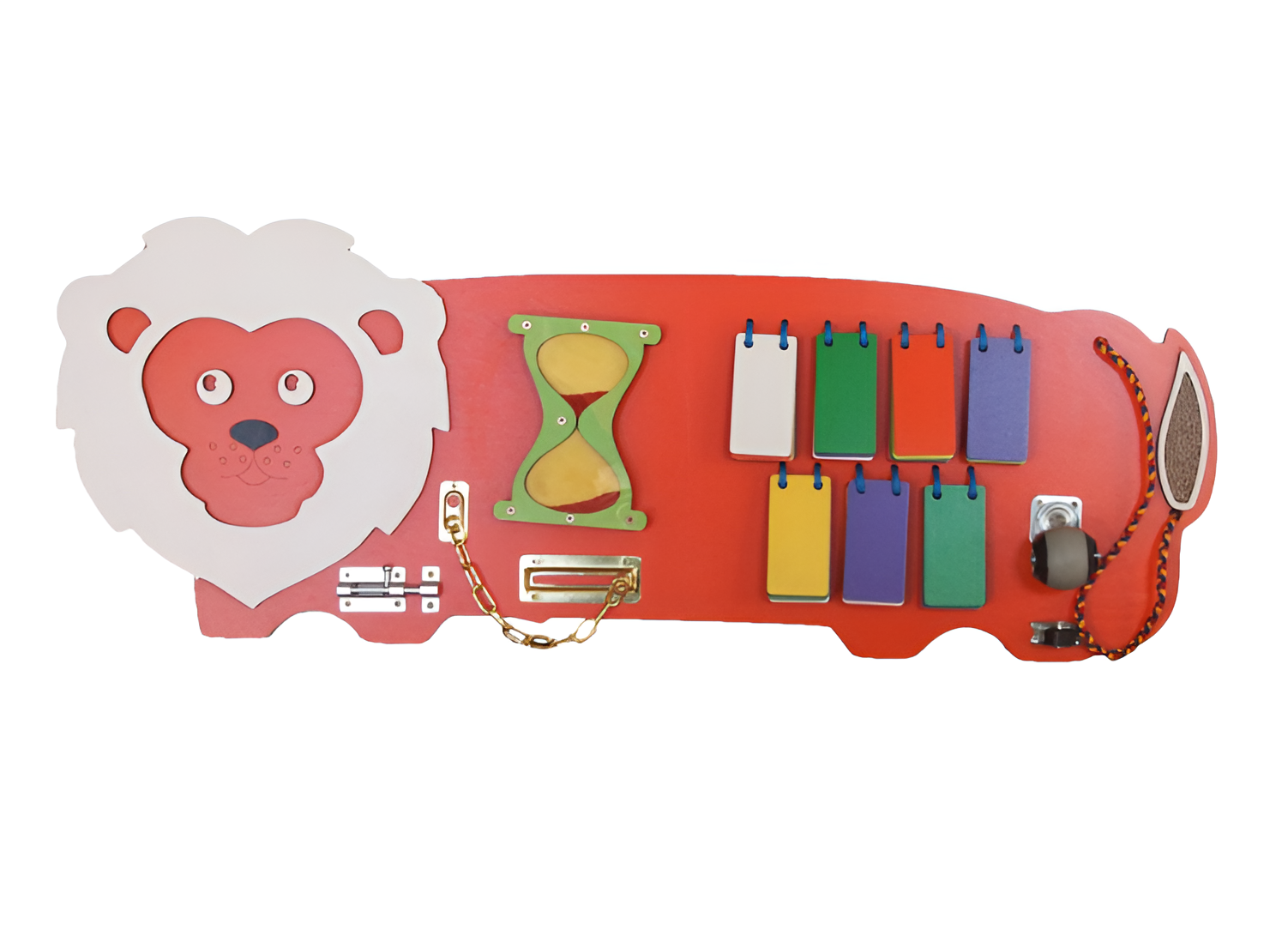 Настенный бизиборд, который будет интересен и увлекателен для детей разных возрастов. Его форма и изображение льва познакомит ребенка с миром животных, интересен будет так же, как персонаж из любимых мультиков. Производитель позаботился о безопасности игрушки: нет острых углов и не оставляет заусенцы. Купить недорогой бизиборд можно для дома, для дошкольных учреждений, для медицинских клиник и для развлекательных центров. Играть можно вместе с ребёнком, описывая каждый предмет ему и рассказывая для чего он нужен, так и наблюдая за игрой малыша.
