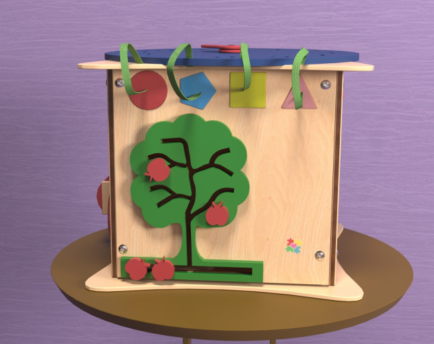 - Покажите ребенку, как работают элементы каждой из сторон бизикуба: сортер с геометрическими фигурками, лабиринт в виде дерева, передвижные фишки в форме яблок. Бизикуб позволяет повторить элементарные навыки в повседневной жизни: зашнуровать ботинки, застегнуть или расстегнуть кофточку, открыть или закрыть дверь. Таким образом, малыш становится самостоятельным.