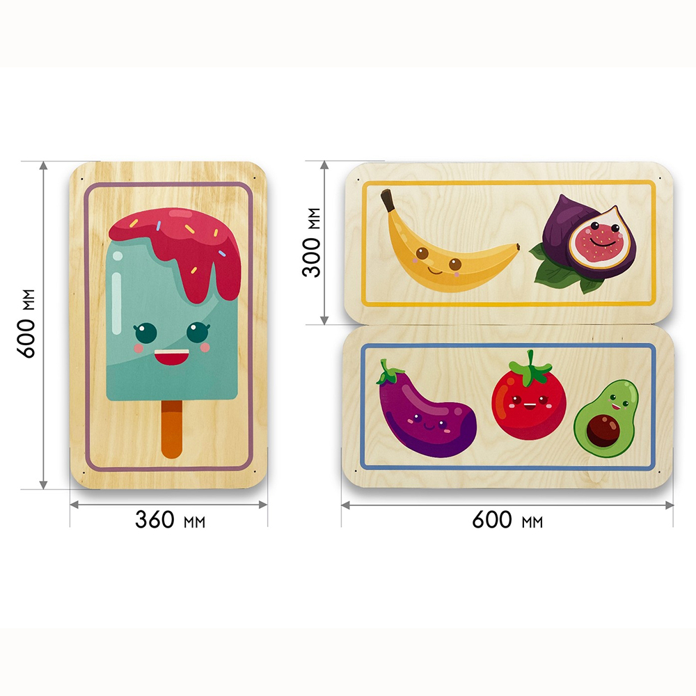 Дополнительные модули бывают однотонные и с тематическими иллюстрациями, подходящими под тематику дидактических панелей. Разнообразие размеров способствует декорированию стен различной конфигурации и масштабов. Параметры варьируются от совсем маленьких модулей 300х300 мм до крупных размеров 600х600 мм.
