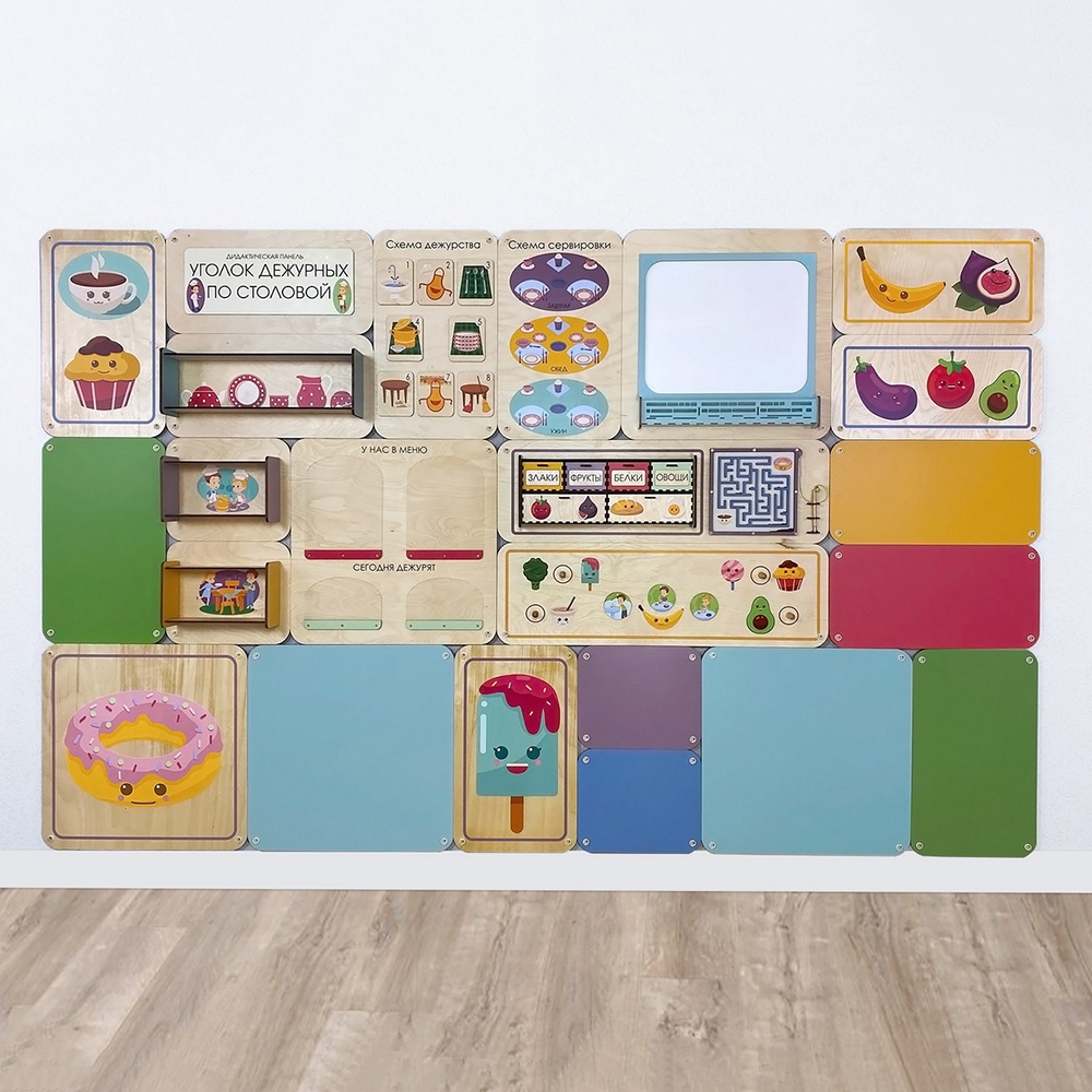 Набор дополнительных модулей для комбинации с дидактическими настенными панелями. Отличное интерьерное решение для оформления помещений в едином стиле.