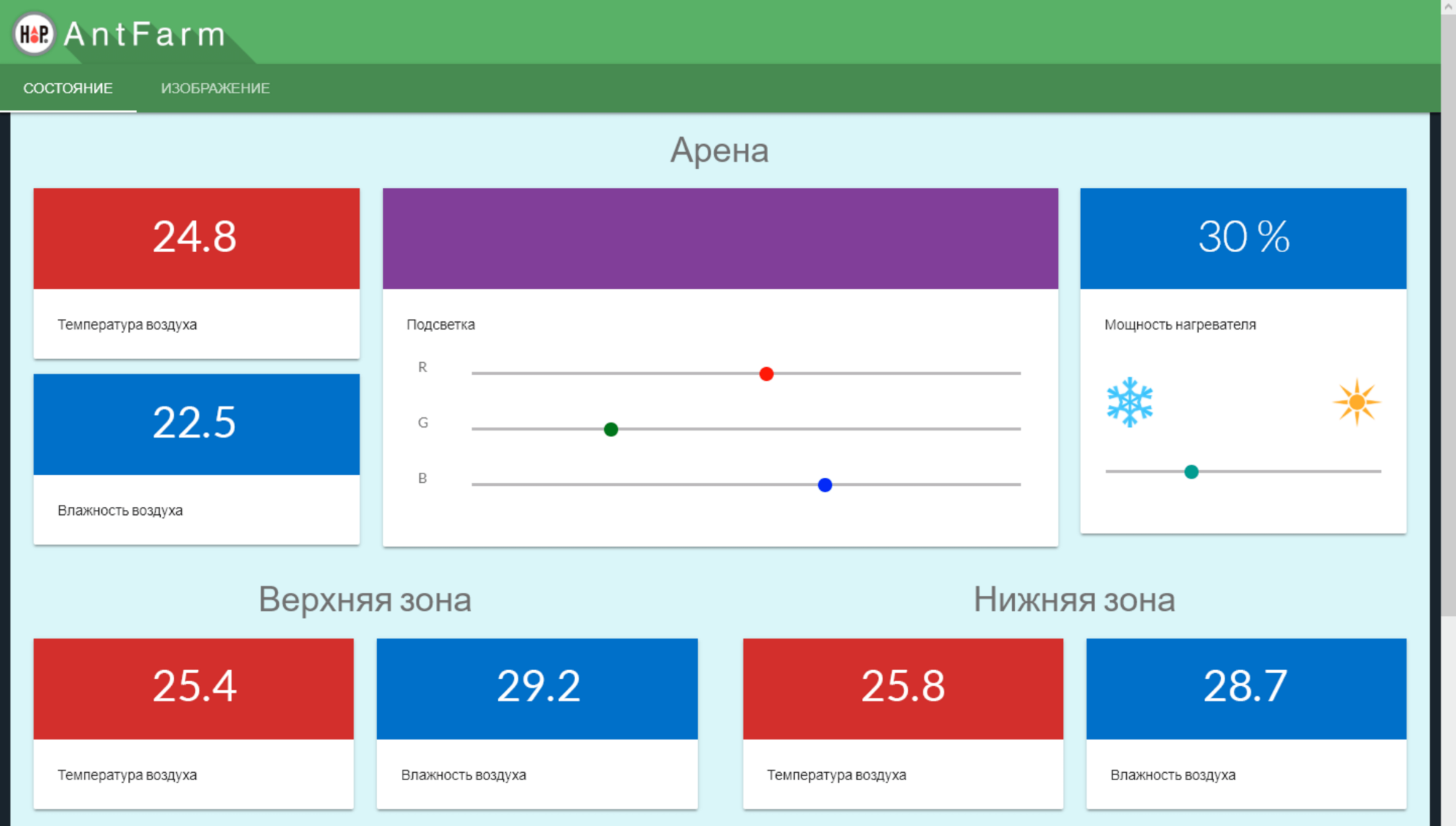 Управление всеми режимами работы и мониторинг за показаниями осуществляются через Web-интерфейс, доступный при беспроводном Wi-Fi подключении микрокомпьютера к локальной сети.