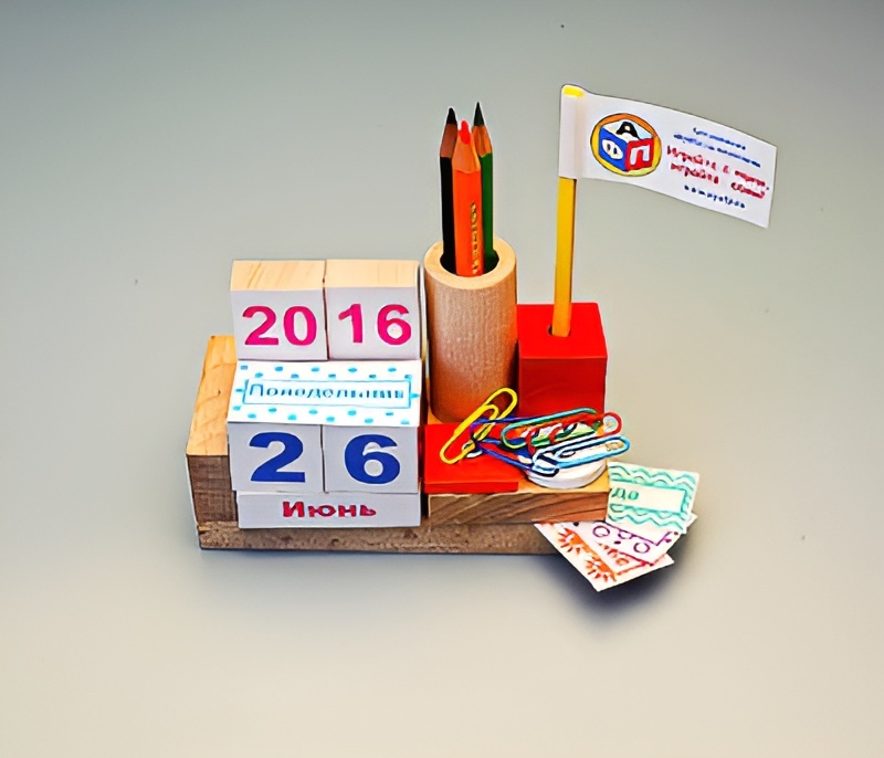 ​Игровой набор представляет собой настольный календарь с наклейками, которым можно пользоваться в течение нескольких лет. Наклейки приклеиваются детьми. С помощью набора дети в игровой форме знакомятся с календарем, а также некоторыми свойствами объемных фигур, позволяющих создать такой календарь. Календарь подходит для организации сюжетно-ролевых игр.
