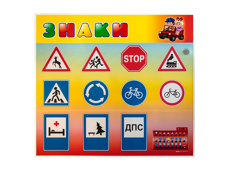 Базовый комплект светового оборудования представляет собой набор из двух информационных панелей, на которых размещено 23 световых элемента в виде наиболее распространенных дорожных знаков.