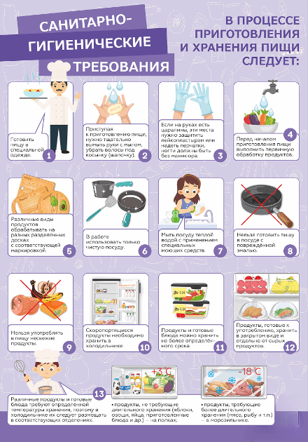 На стенде отображены основные санитарно-гигиенические требования, которые необходимо соблюдать в процессе приготовления и хранения пищи.