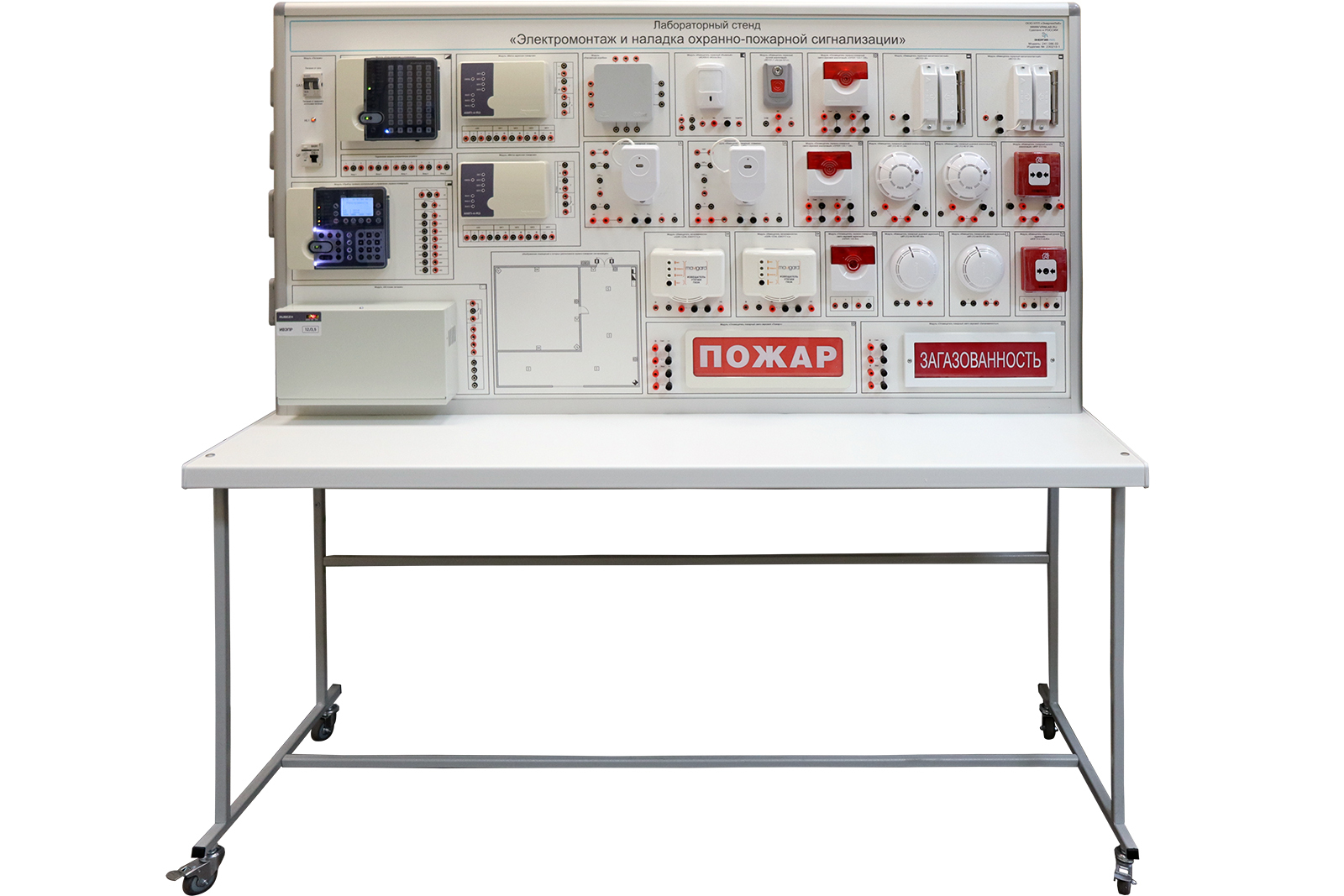 Лабораторный стенд предназначен для закрепления базовых знаний по принципам функционирования охранно-пожарной сигнализации, извещателей различных типов и получения первоначальных навыков по электрическому монтажу и наладке охранно-пожарной сигнализации, устанавливаемых внутри помещений.